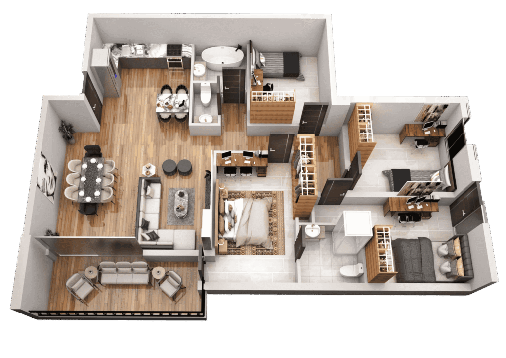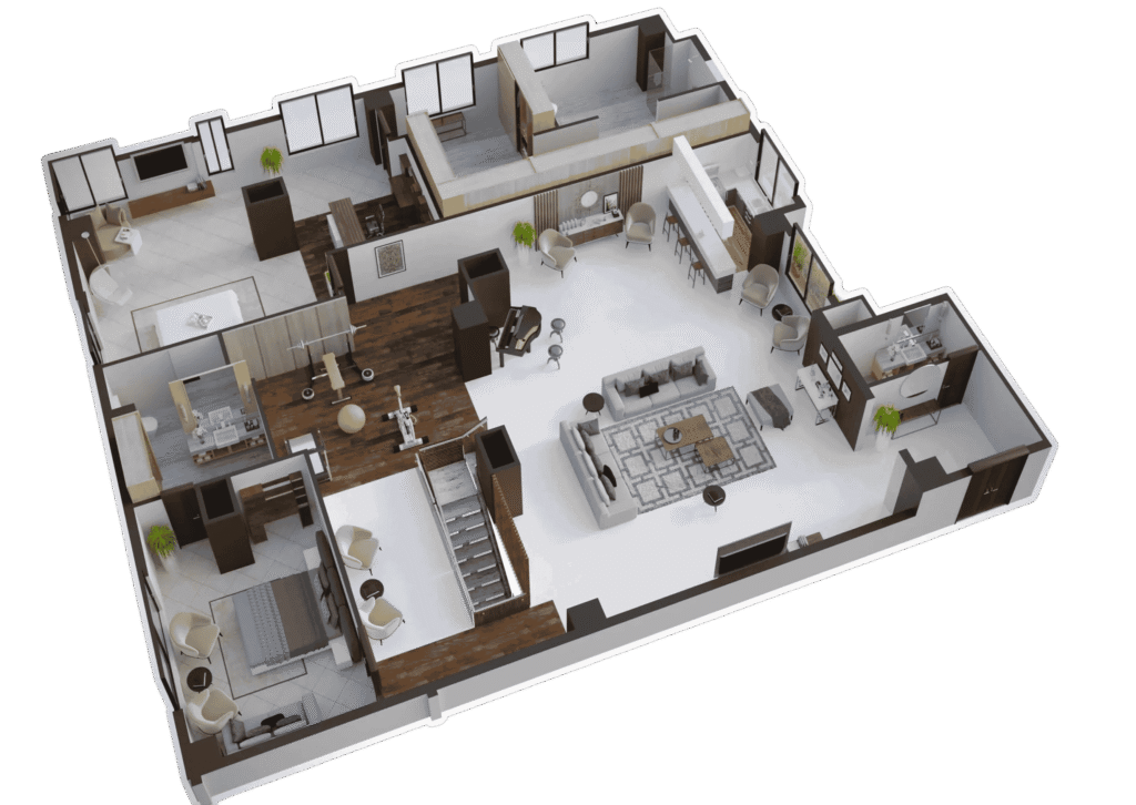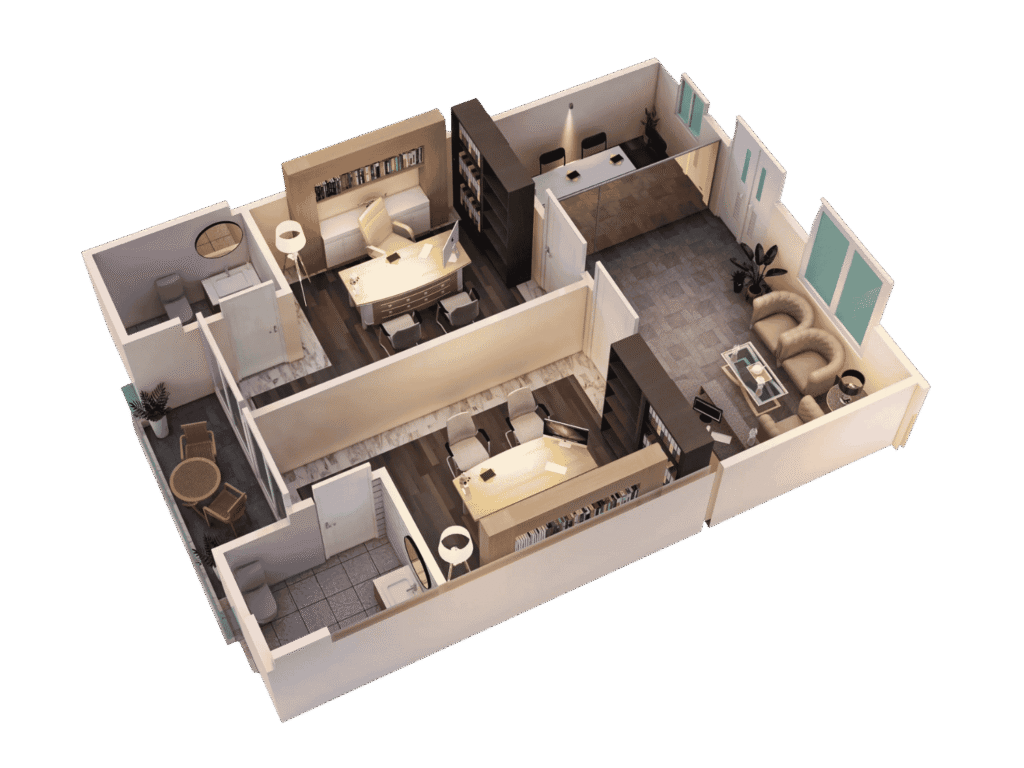Our 3D floor plan visualization services are highly versatile and suitable for a wide range of projects. For residential developments, we create detailed visualizations of 2 bedroom floorplans, 3 bedroom floorplans, and multi-unit homes, allowing clients to experience every space before construction. For modern homes, we showcase contemporary layouts complete with furniture, lighting, and décor to convey the design’s true feel. In commercial spaces, our 3D floor plans clearly present office layouts, retail units, and public areas, enhancing spatial understanding. Additionally, our visualizations are ideal for real estate marketing, providing engaging content for brochures, websites, and interactive campaigns. They are also invaluable in architectural planning, helping architects and developers evaluate spatial flow, room arrangements, and furniture placement prior to construction.